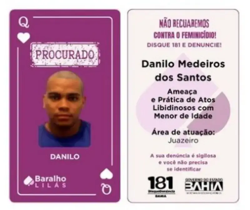A Polícia Civil da Bahia prendeu, na manhã desta segunda-feira (15), em Juazeiro, Danilo Medeiro dos Santos, de 30 anos, investigado pelos crimes de ameaça e estupro de vulnerável. Ele integrava o Baralho Lilás da Secretaria da Segurança Pública da Bahia (SSP), iniciativa que divulga procurados por violência contra a mulher.