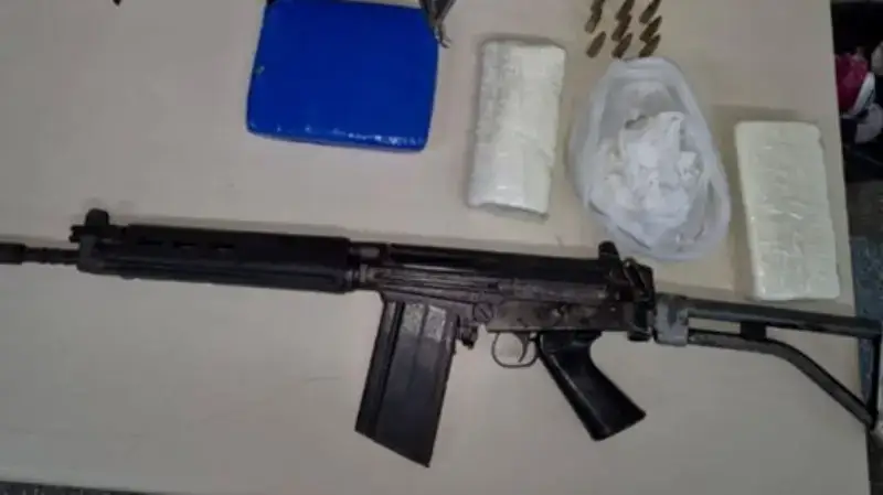 Em seguida, os policiais iniciaram buscas na área e encontraram um acampamento improvisado. No local, foram apreendidos um fuzil calibre 762 com numeração raspada, um carregador, 13 munições, além de 2 kg de maconha e aproximadamente 1,4 kg de cocaína.
