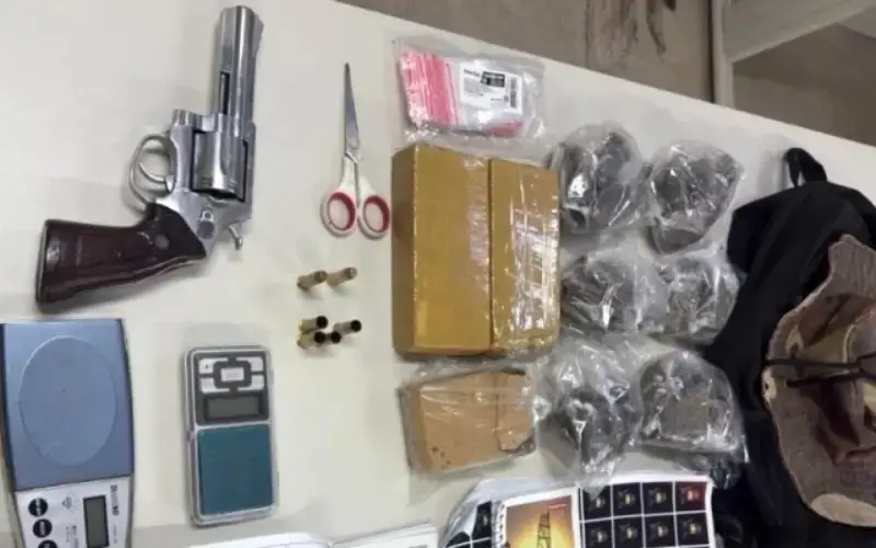 Durante a ação, os agentes apreenderam um revólver calibre 38 com numeração raspada, quatro munições deflagradas e duas intactas. Também foram encontrados 50 trouxinhas e dois tabletes e meio de maconha, além de materiais usados no tráfico de drogas, como balanças de precisão, cadernos de anotações, embalagens plásticas e uma mochila preta.