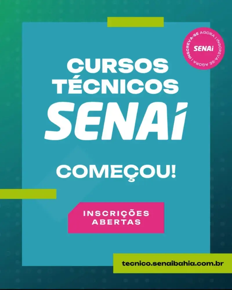 Entre as áreas disponíveis estão: Administração, Automação Industrial, Biotecnologia, Desenvolvimento de Sistemas, Eletromecânica, Eletrotécnica, Petroquímica, Química, Refrigeração e Climatização, Segurança do Trabalho e Qualidade. As inscrições devem ser feitas exclusivamente pelo site oficial do SENAI Bahia.